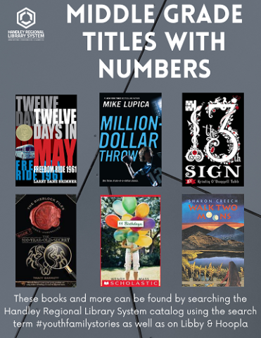Our middle grade book spotlight this week is on books that have numbers in their titles!!! There are times when titles need more than just words to describe what is happening and to catch your attention as you browse the shelves. We have a great mixture of fantasy, nonfiction, realistic, sports, and more so there is something for everyone and the titles are easy to remember because numbers do make a difference! These books and more can be found by searching the catalog using the search tag #youthwithnumbers as well as on Libby and Hoopla. Check back next week for a new middle grade book spotlight and if you have any book suggestions, please let us know!!
