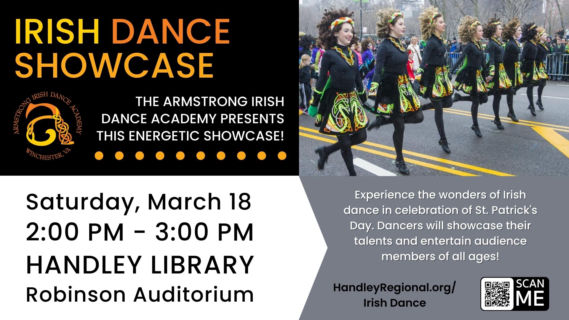 Experience this energetic performance showcase from Irish dancers of all ages in celebration of St. Patrick's Day. Presented by Armstrong Irish Dance Academy. Program is intended for patrons of all ages.
