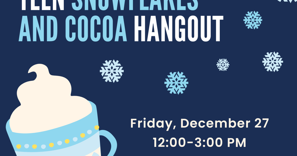 Join us for a special winter edition extended Teen Hangout in the Meeting Room with games, activities, snacks, and time with friends. Games from Uno, Apples to Apples; as well as coloring, LEGO bricks, puzzles, crafts, and more will be available; or bring your own activities! Our winter themed fun includes making snowflakes and a hot cocoa bar to cozy up on a cold day.