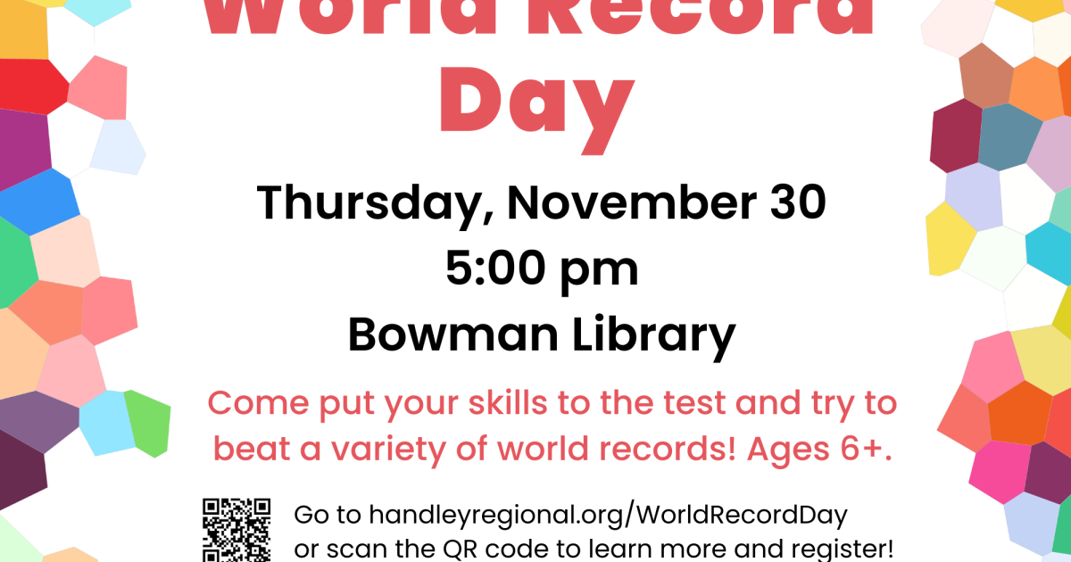 Programs, events, and daily happenings sponsored by Handley Regional Library System may be photographed or recorded. Attendance at any sponsored program, event or general library use constitutes the consent of all attendees and the consent of the parents or legal guardians of any minor children in attendance, to the future broadcast, publication, and other use of photography or videos at the sole direction of Handley Regional Library System.
