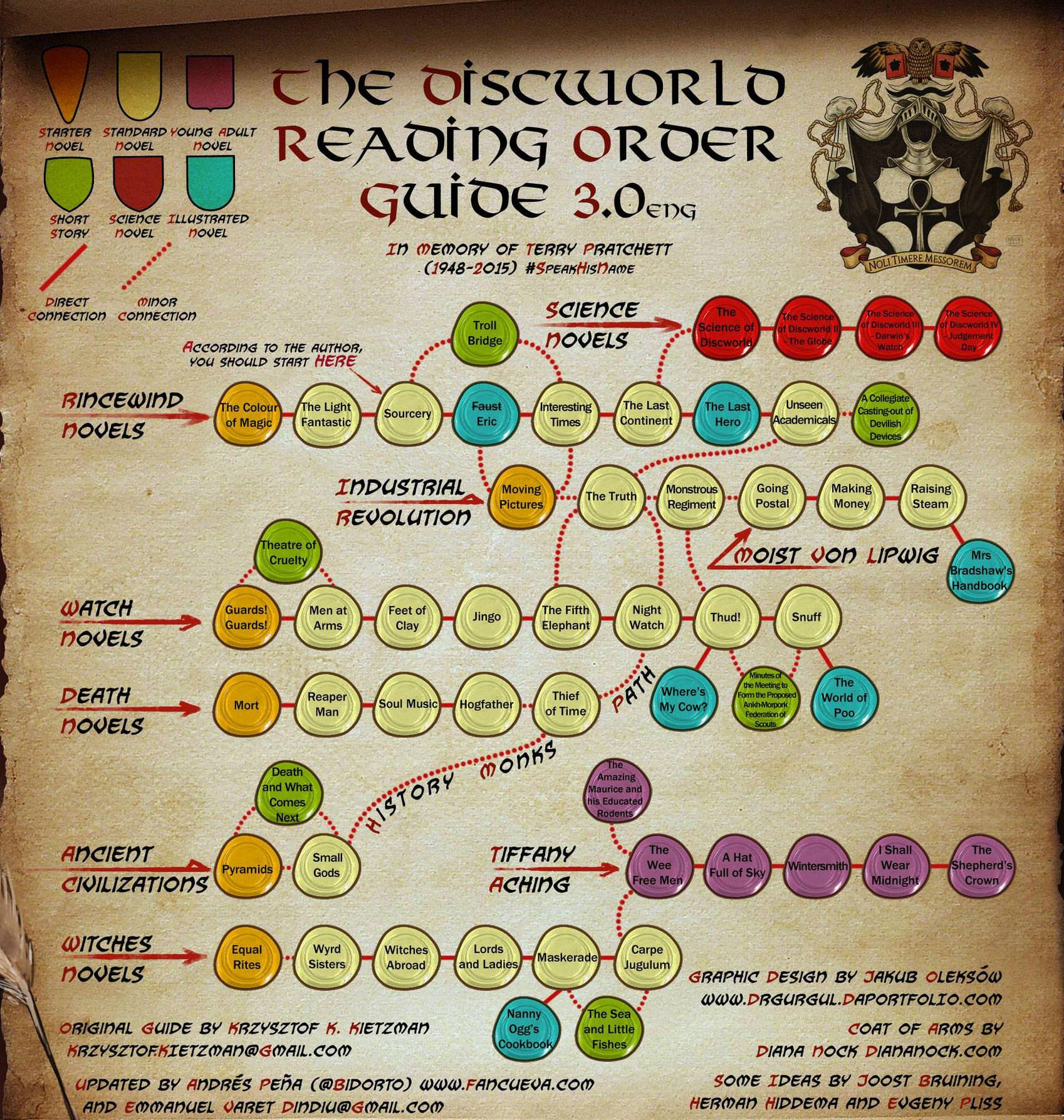 Pratchett is best known for his Discworld series, a sprawling, satirical fantasy series set on a flat disc-shaped planet which rests on the backs of four elephants, which in turn stand on the back of the cosmic turtle (as is common knowledge). The majority of his books (41 of them!) take place in this universe, and I highly recommend starting there. You can read the Discworld novels in any order, as each book stands on its own, but many of them are centered on recurring characters and are best enjoyed chronologically. Here’s a couple of links to get you started! I’m also including a handy reference chart down at the bottom of this post, to look at when you inevitably fall in love with a specific character and need to read every book in which they appear.
