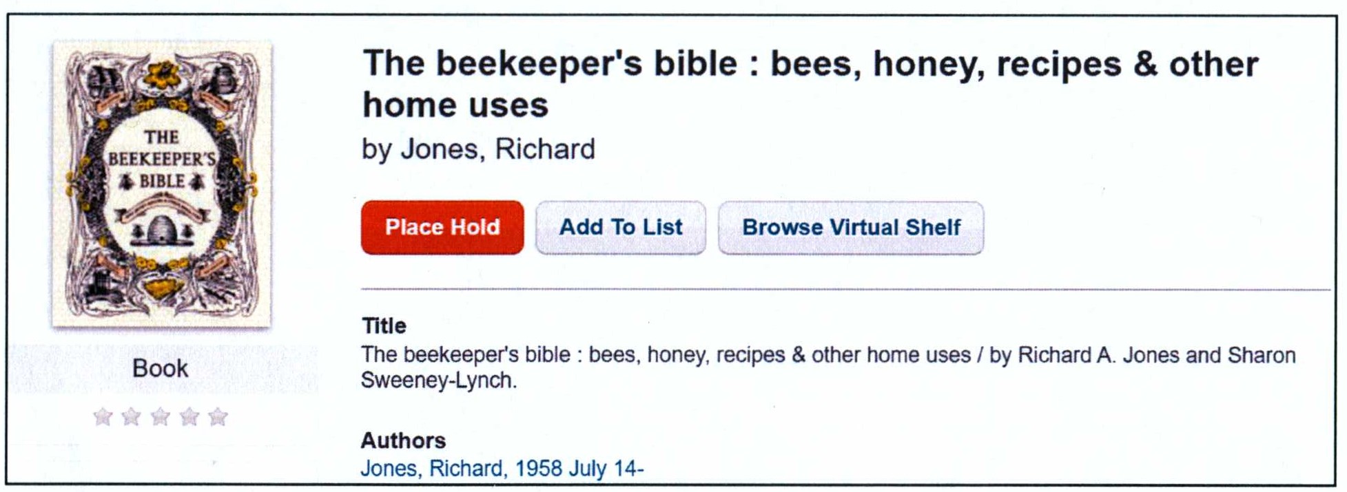 This is a good place to provide a reminder about “Holds” and “Browse Virtual Shelf”. Although library buildings are still closed to the public, you can check out material by placing a “hold” (a request.) If you have not used this feature before, here is a link to a short video explaining the process. Physically browsing through the bee books is not currently possible, but we have the “Browse Virtual Shelf” feature. After you find a book in the library’s catalogue (such as the “Beekeeper’s Bible”) and click on the title, you are taken to the page where you can place a “hold.” Notice the button for “Browse Virtual Shelf”: