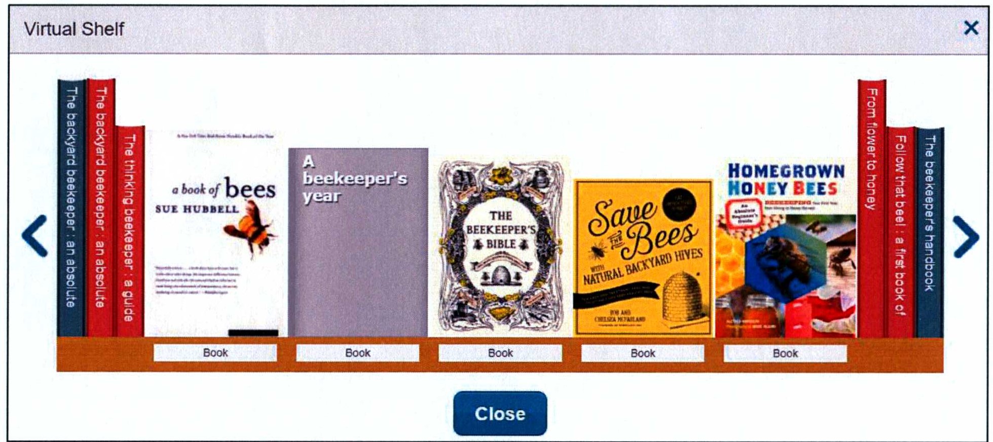 After clicking on the “Browse Virtual Shelf” button you will see the adjacent books on bees. You can use the arrows to travel along the shelf. If you click on a book it brings you to the page with details about the book. Click on the “Browse Virtual Shelf” button again to return to your search.