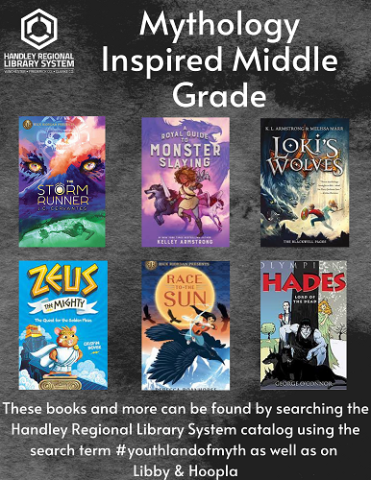 Our middle grade book spotlight this week is on books that feature books that have been inspired by different mythologies!! I love learning about mythology with all of the different gods, goddesses, monsters, heroes, and myths and all of our titles this week would not be here without their inspiration. We have stories that have been inspired by Greek, Norse, Mayan, and other mythologies. They are adventure and action packed as well as some mixed into humor and even some graphic novels. These books and more can be found by searching the catalog using the search tag #youthlandofmyth as well as on Libby and Hoopla. Check back next week for a new middle grade book spotlight and if you have any book suggestions, please let us know!!
