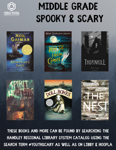 Our middle grade book spotlight this week is on books that are filled with spooks and scares!! Just in time to get you ready for Halloween, these books are filled with ghosts, spirits, creepy dolls that have come to life, unexplained happenings, and other spooky creatures that may have you reading with the lights turned on (I dare you to read with the lights turned off and just a flashlight). These books and more can be found by searching the catalog using the search tag #youthscary as well as on Libby and Hoopla. Check back next week for a new middle grade book spotlight and if you have any book suggestions, please let us know!!