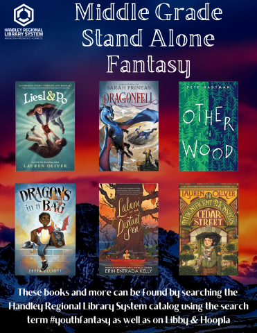 Our middle grade book spotlight this week is focused on books that are stand alone fantasy titles! Let’s get real here for a second--there is something to be said when you find an amazing series that you just cannot put down, but not everyone has time for a series or sometimes you just want a book that has a beginning, middle, and end all within a front and back cover. That’s why we are taking a look at some fantasy titles that are not part of a series; they are stand alones novels for when you want your fantasy but do not have to read 6 books to find out what happens to your favorite main character or the epic battle between good and evil. These books and more can be found by searching the catalog using the search tag #youthfantasy as well as on Libby and Hoopla. Check back next week for a new Middle Grade book spotlight and if you have any book suggestions, please let us know!!