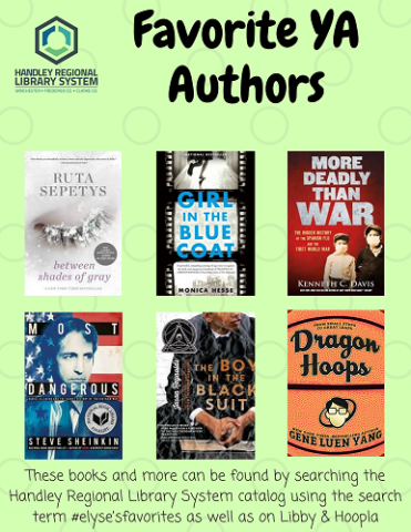 Our teen book spotlight this week is on books that are some of my all time favorite authors!!! These are the authors that as soon as they have a new book out, it is an immediate must read and I already know that I am going to be reading till 3:00 in the morning (we have all been there before), may leave me speechless and filled with emotions (including some crying on the couch), wanting to talk about it with someone instantly, and then telling everyone else they have to read it! There is some nonfiction, graphic novelists, and a mix of historical and realistic; this was such a hard list to make. These books and more can be found by searching the catalog using the search tag #elyse’sfavorites as well as on Libby and Hoopla. Check back next week for a new teen book spotlight and if you have any book suggestions, please let us know!!