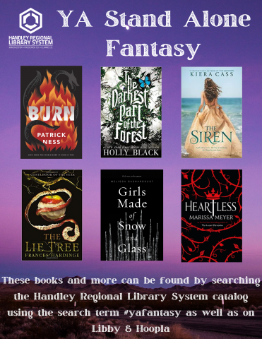 Our teen book spotlight this week is focused on books that are stand alone fantasy titles! Let’s get real here for a second--there is something to be said when you find an amazing series that you just cannot put down, but not everyone has time for a series or sometimes you just want a book that has a beginning, middle, and end all within a front and back cover. That’s why we are taking a look at some fantasy titles that are not part of a series; they are stand alones novels for when you want your fantasy but do not have to read 6 books to find out what happens to your favorite main character or the epic battle between good and evil. These books and more can be found by searching the catalog using the search tag #yafantasy as well as on Libby and Hoopla. Check back next week for a new teen book spotlight and if you have any book suggestions, please let us know!!