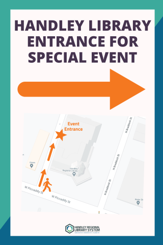 **This is an after hours event, and, as such, interested patrons can enter near the book drop entrance of Handley Library. See picture of attached directional map.**