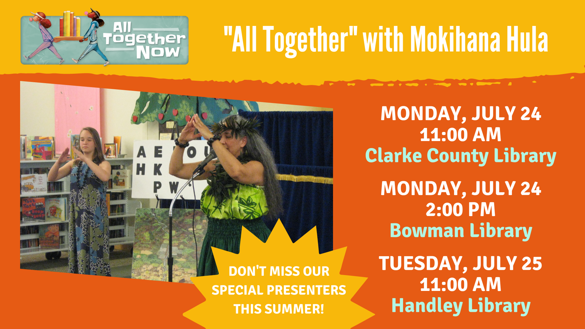 It is All Together Now as you learn to hula dance. The hula tells a story and you will learn how to share the legend together. Your feet, hands, arms and body will sway and dance to delight everyone. Let's share stories and dance...together!
