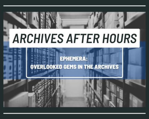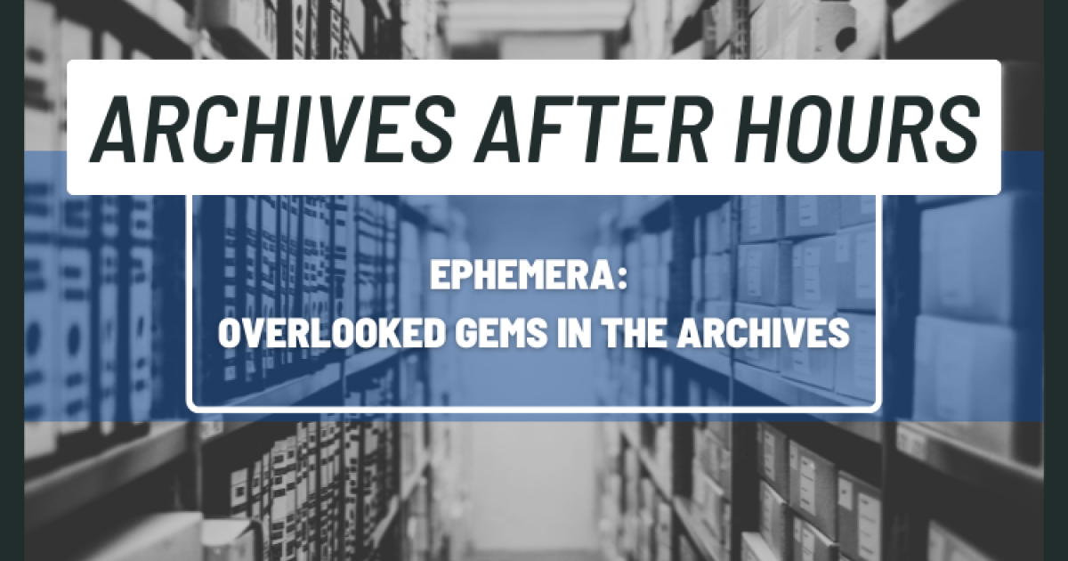 Our last Archives After Hours of the year's topic is ephemera. Ephemera is defined as items that were designed to be used for only a short period of time, such as programs, tickets, and broadsides. Often overlooked as memorabilia, these items are still valuable parts of our collections and have stores to tell. Join us to view some examples of ephemera from our collections.