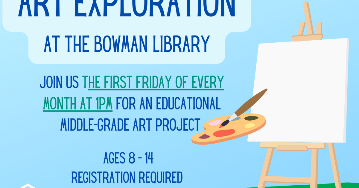 Join us the first Friday of every month at 1pm for a fun and educational art project. This month's theme is quilting! Design a quilt square and get a chance to use a sewing machine. Your work will be displayed in the Bowman Children's Room!