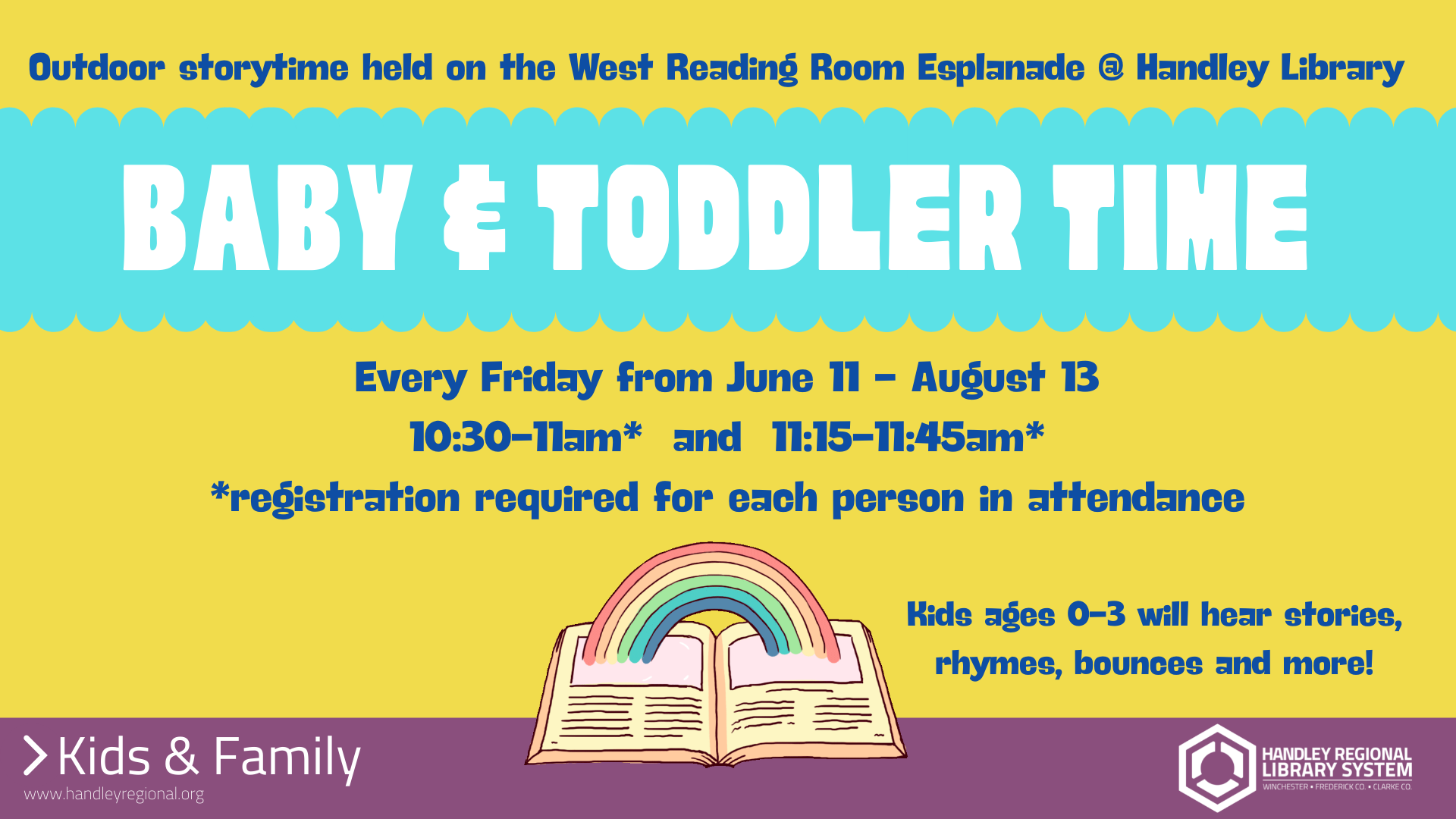Enjoy an early literacy program for infants and toddlers consisting of stories, rhymes, bounces, and more. Program held outside on the West Reading Room Esplanade (enter through the front doors of the library to be directed). *Registration required for each person in attendance. Ages 0-3.