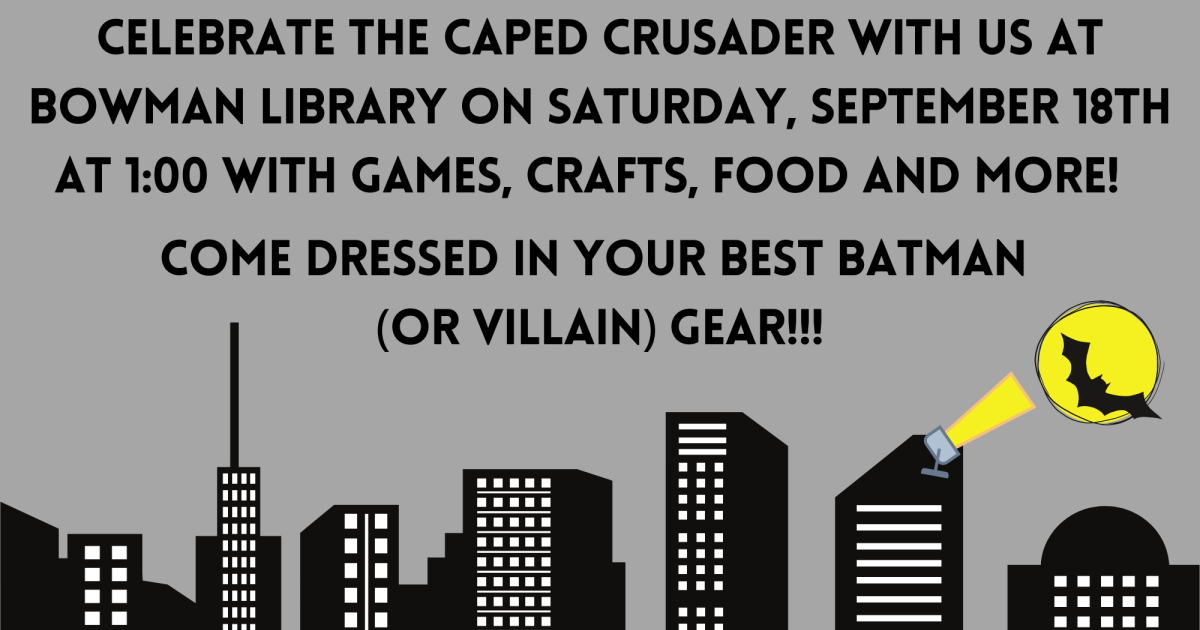 All are invited as we celebrate the ultimate Caped Crusader with a day dedicated to all things Batman!! Come in your best Batman (or villain) inspired outfit and join in the fun with games, crafts, activities, food, and more!