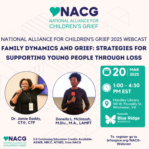 Join us for a webcast from the National Alliance for Children's Grief titled Family Dynamics and Grief: Strategies for Supporting Young People Through Loss. Hosted by Blue Ridge Hospice and Handley Library.