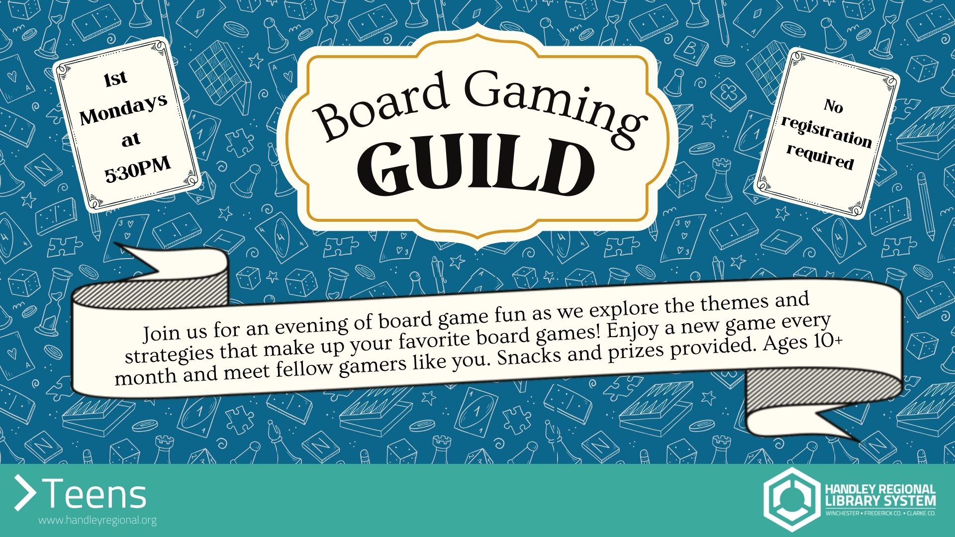 Join us for an evening of board game fun as we explore the themes and strategies that make up your favorite games! Enjoy a new board game every month and meet fellow gamers like you. Snacks and prizes provided. Ages 10+.