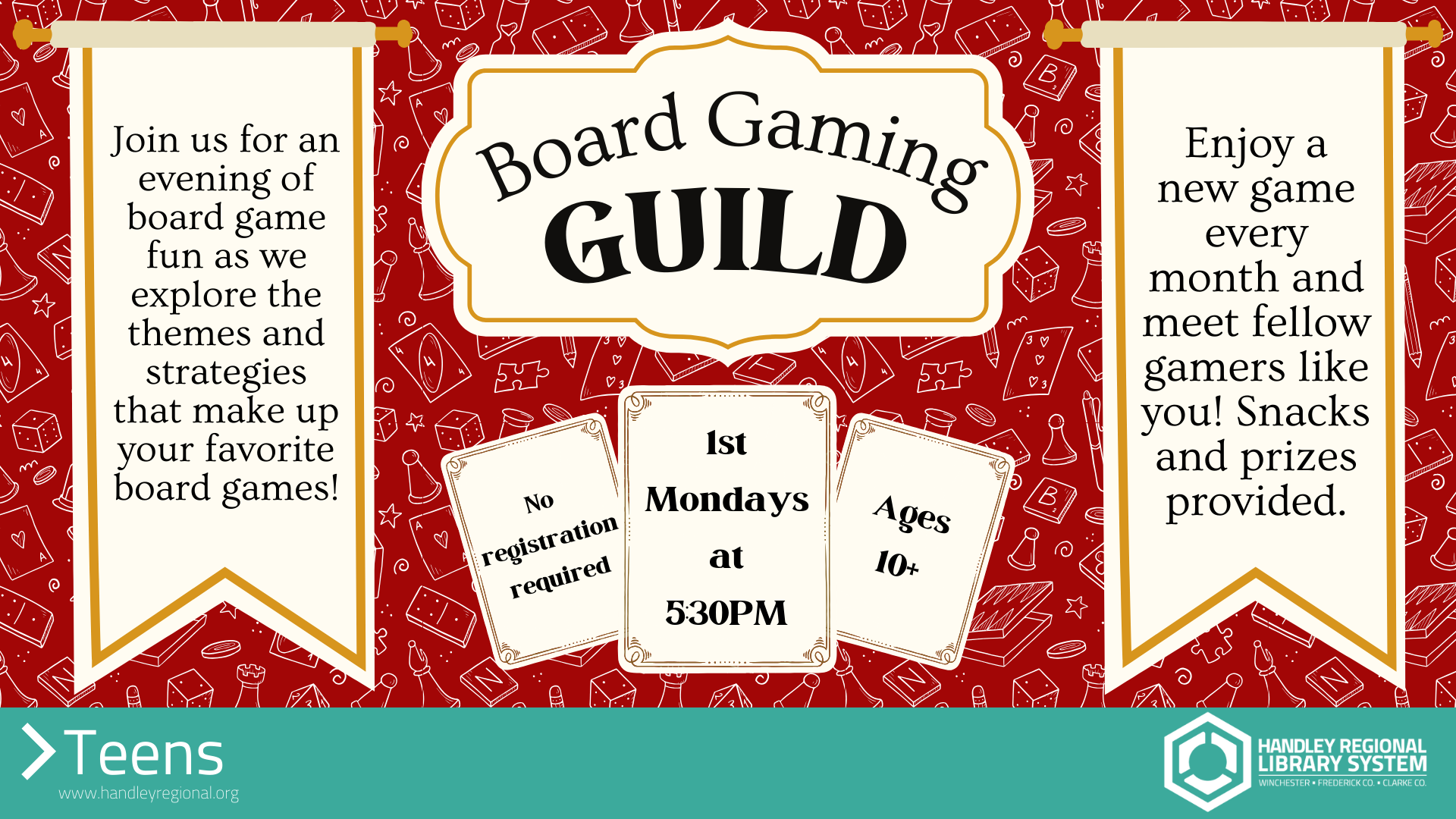 Join us for an evening of board game fun as we explore the themes and strategies that make up your favorite games! Enjoy a new board game every month and meet fellow gamers like you. Snacks and prizes provided. Ages 10+.