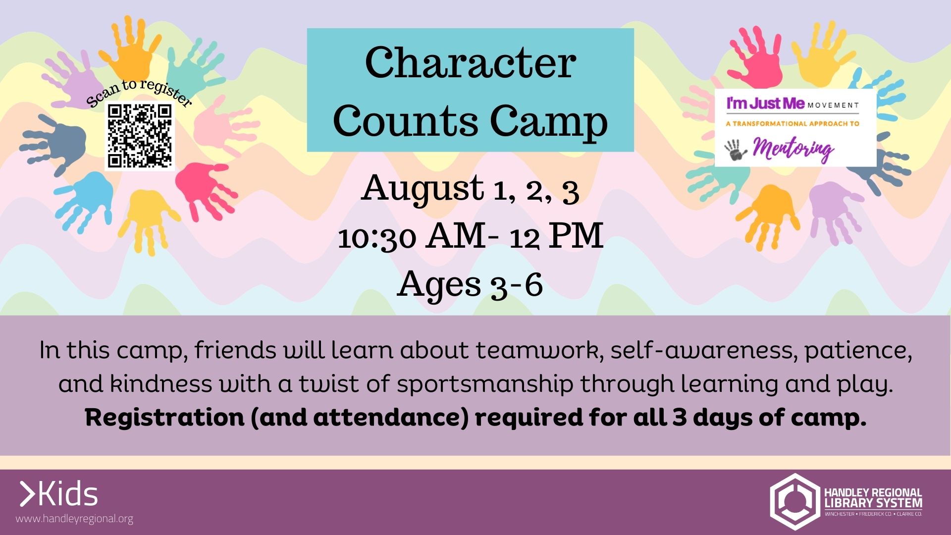 In this camp, friends will learn about teamwork, self-awareness, patience, and kindness with a twist of sportsmanship through learning and play. Presented by I'm Just Me Movement. Program is intended for ages 3-6 and their caregivers. Registration (and attendance) required for all 3 days of camp. Please limit Handley camp registrations to one (1) total per child this summer as camp spots are limited.