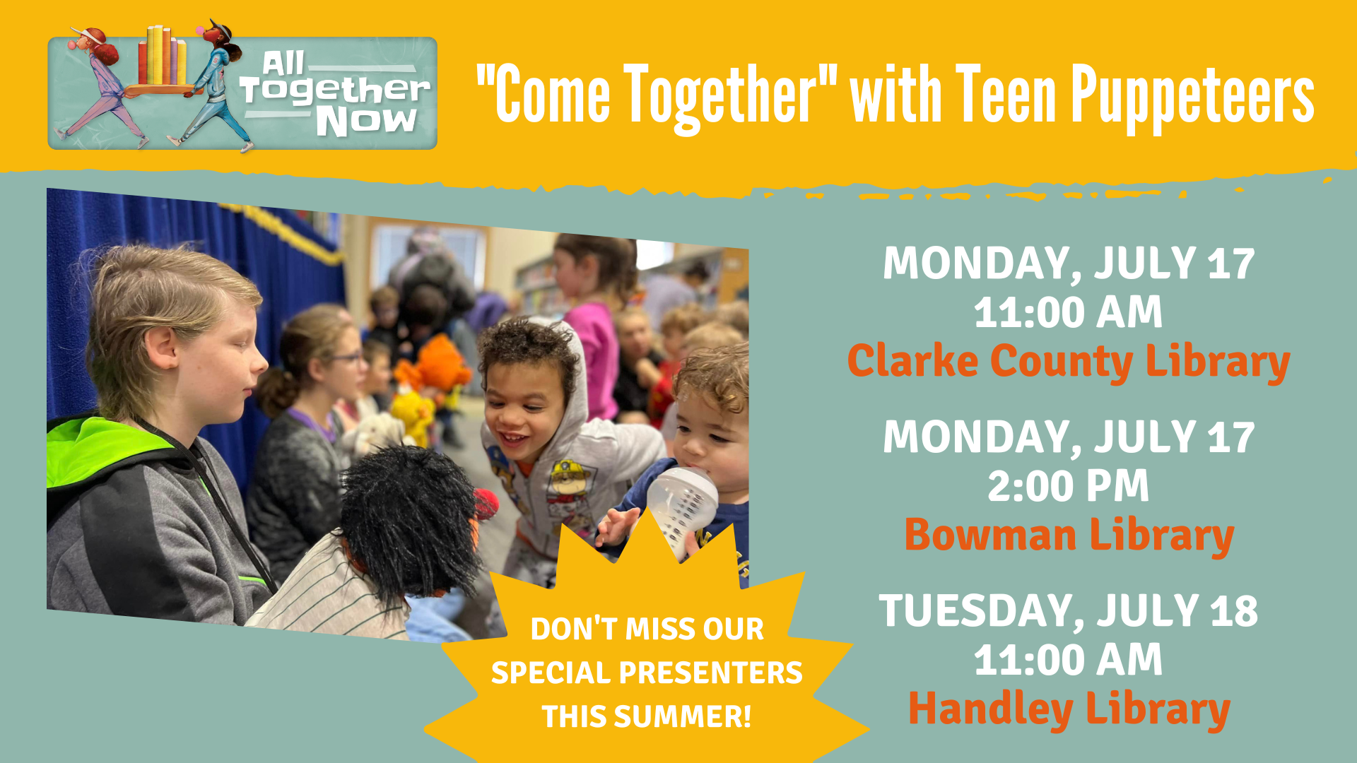 Puppets share their voices! The puppets work together to bring singing, dancing, story sharing and music making. Your feet will be dancing throughout the musical show! Come and join in on the fun. Let's read, sing, and dance...together!