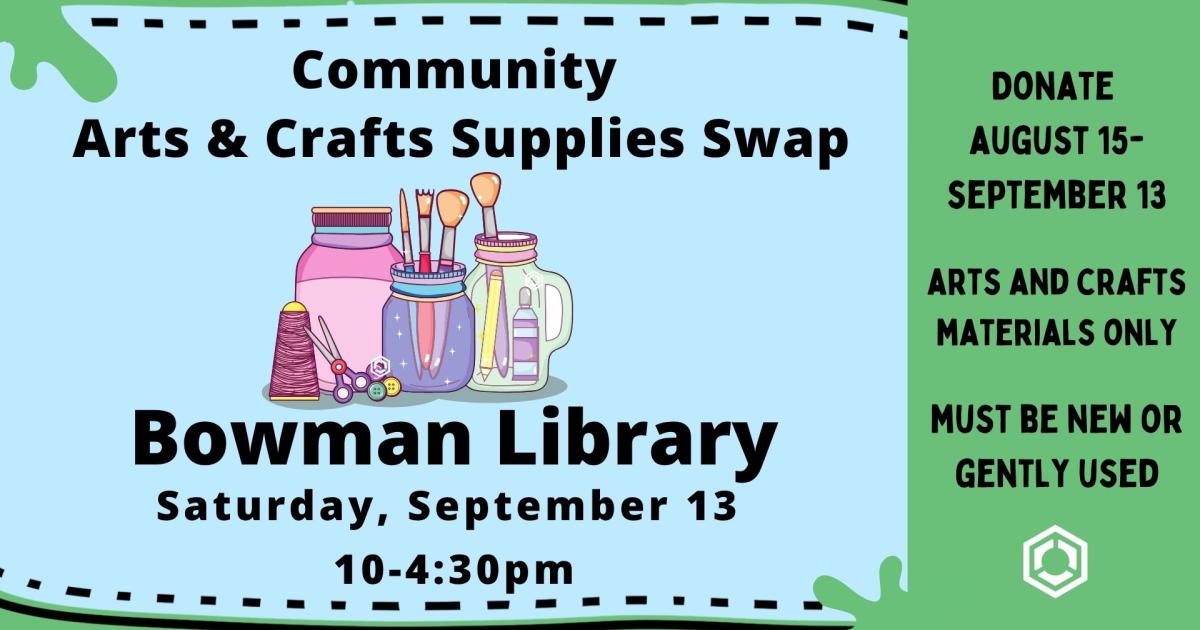 Bowman Library is holding our 4th Community Arts and Crafts Supply Swap! This is a wonderful opportunity to trade new and gently used arts and crafts materials with others.