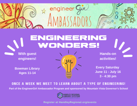Come to Bowman Library to learn about the wonders of engineering with Engineer Girl Ambassador Kendall Clark and other guest engineers.