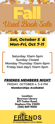 - Patrons may enter and exit the sale through the back exterior emergency exit door of the Bowman Meeting Room leading to the parking lot (look for the "Used Book Sale Today" sign and red feather flag)