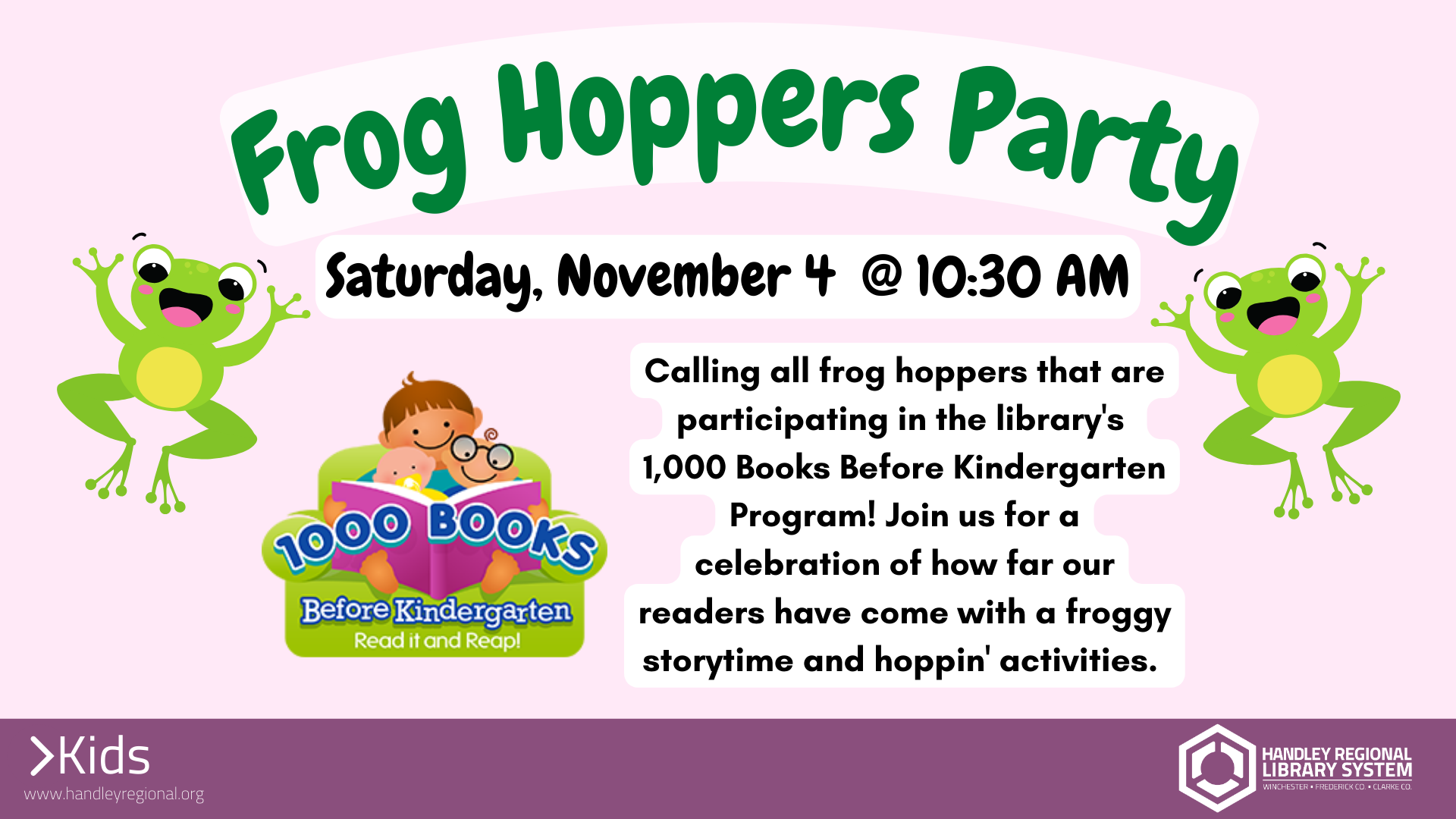 Calling all frog hoppers that are participating in the library's 1,000 Books Before Kindergarten Program! Join us for a seasonal celebration of how far our readers have read. Enjoy a froggy storytime with hoppin' activities and take-home prizes. Program is intended for active 1KBb4K participants, but all are welcome. *Registration is encouraged.