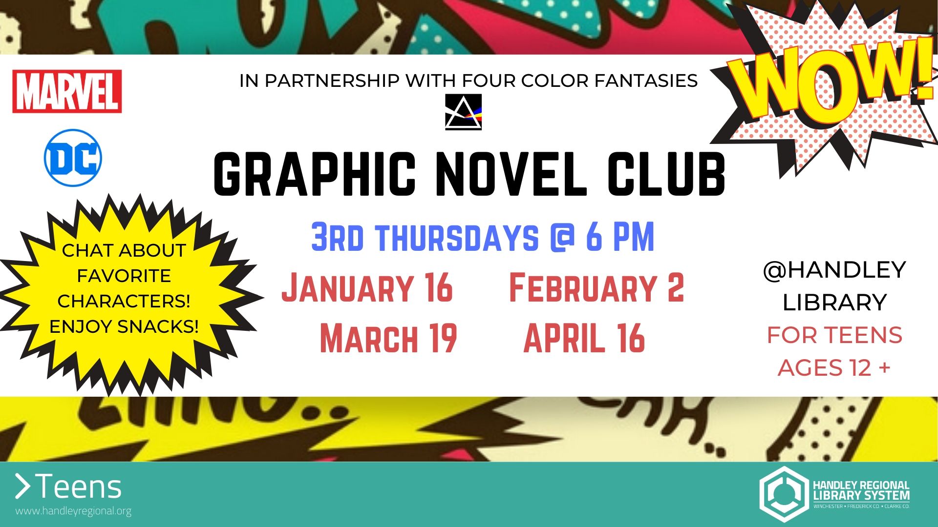Chat about your favorite DC and Marvel characters and enjoy snacks with our friends from Four Color Fantasies. Ages 12+