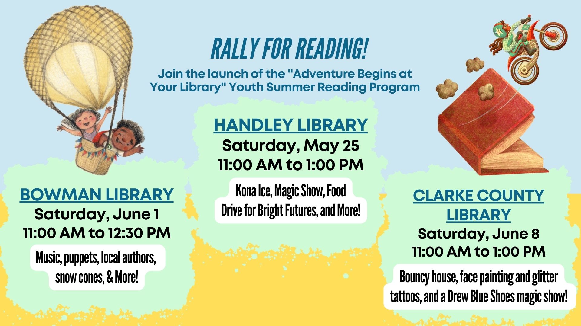 Celebrate the launch of the “Adventures At Your Library” Youth Summer Reading Program. Pre-register for the program as you enjoy activities around the Reading Garden, eat Kona Ice, and experience a magic show at 11:30 AM with Drew Blue Shoes! Join us for more fun surprises throughout the day, too.