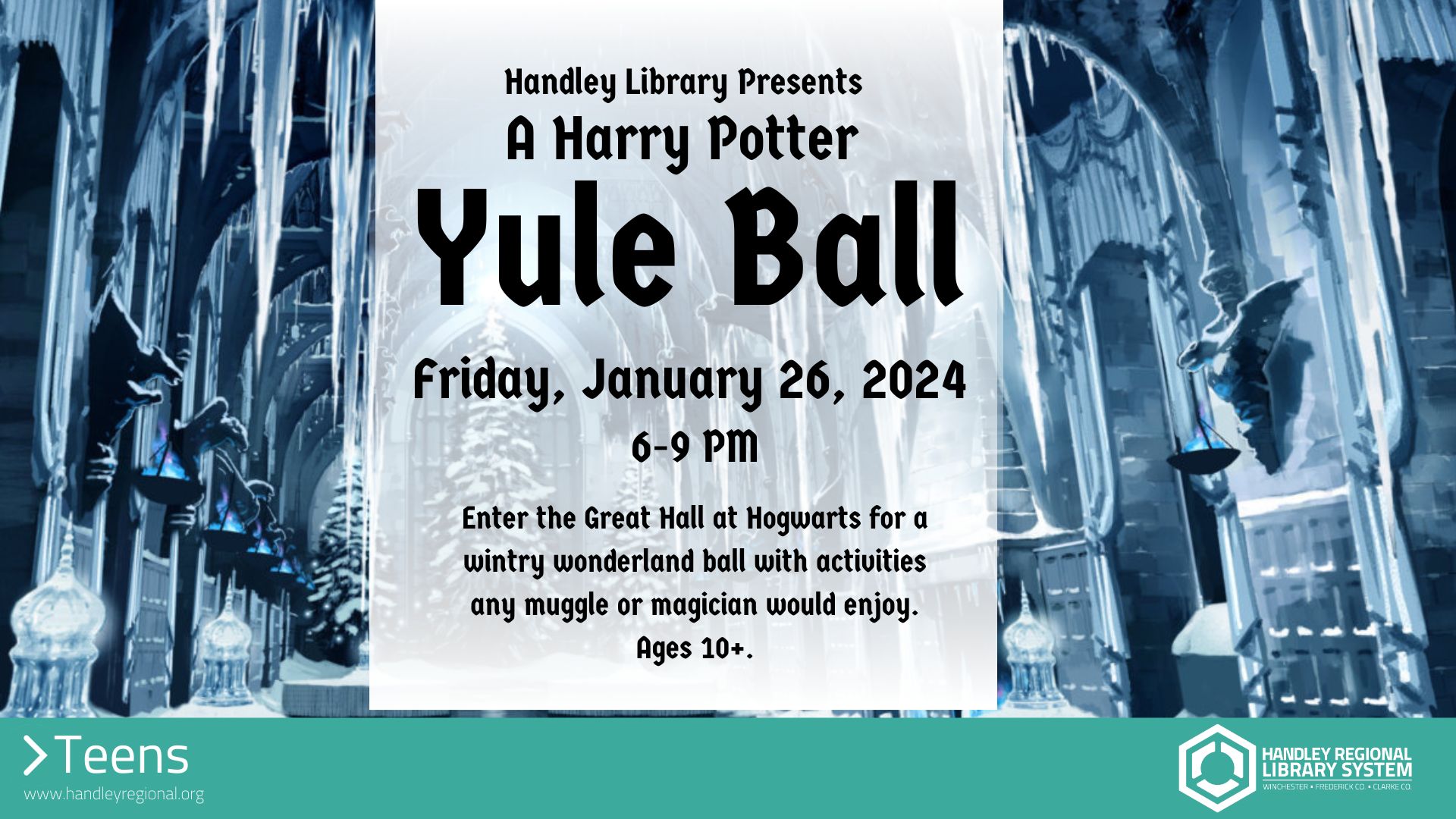 Enter the Great Hall at Hogwarts for a wintry wonderland ball with activities any muggle or magician would enjoy. Ages 10+.