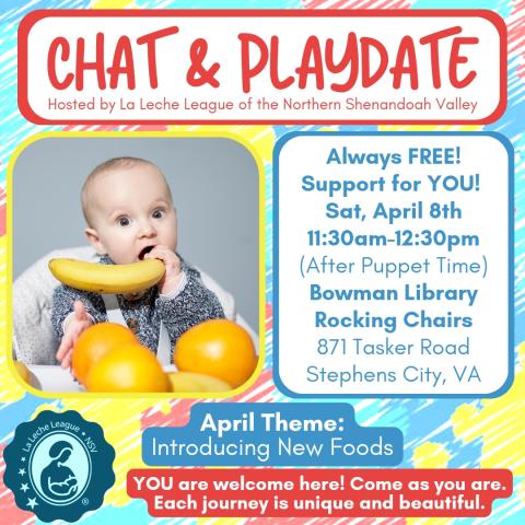 Join La Leche League in the Bowman Children's room for a pro-breastfeeding hangout with other parents. This week's discussion theme is introducing new foods.