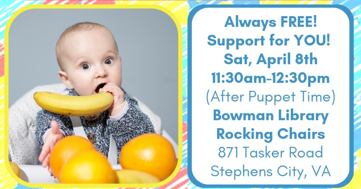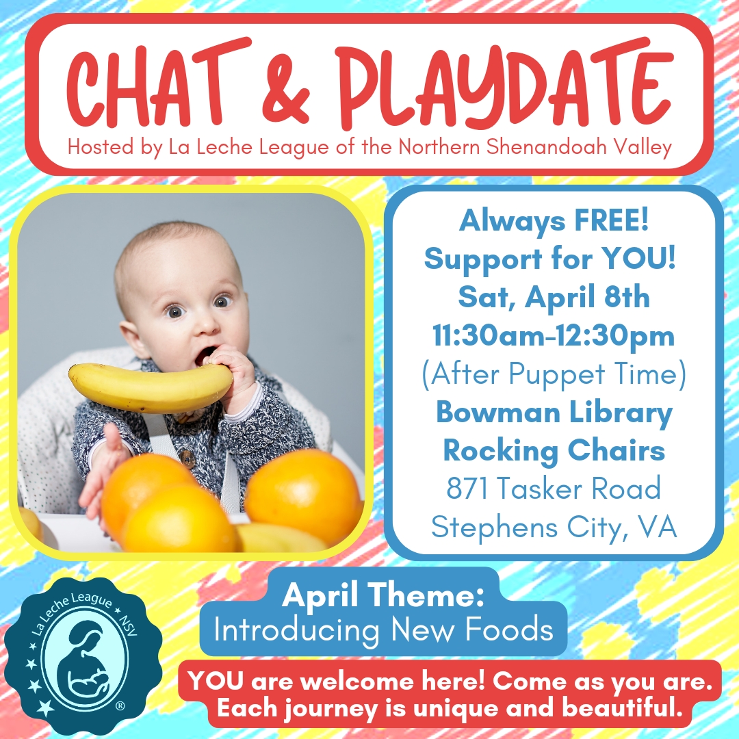 Join La Leche League in the Bowman Children's room for a pro-breastfeeding hangout with other parents. This week's discussion theme is introducing new foods.