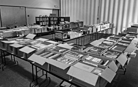 Unsorted books placed on tables and on shelves in meeting room. Fiction, Non-Fiction, Paperbacks, DVDs and CDs and Children’s books will be available. Restocking will occur as space becomes available throughout the sale.
