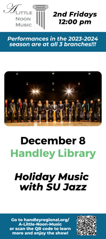 The Friends of the Handley Regional Library System presents a new season of A Little Noon Music. Every second Friday at noon, a variety of musicians delight audience members with their talents. The 2023/24 season has concerts at all three branches in our library system!