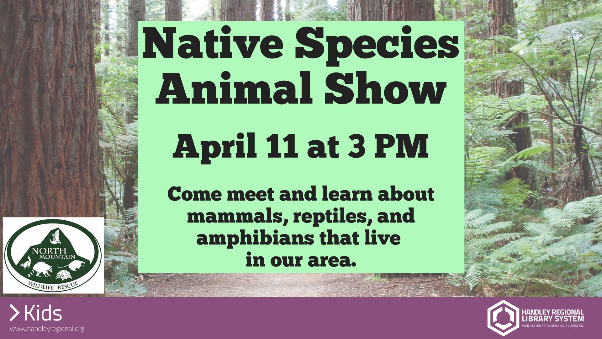 Primary tabs Upcoming List Month Week Day Remind Me Add To My Calendar Print Share Age Group: Children, Families Please note you are looking at an event that has already happened. Program Description Event Details Come meet and learn about mammals, reptiles, and amphibians that live in our area.