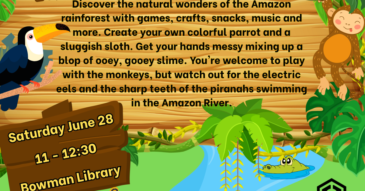 Discover the natural wonders of the Amazon rainforest with games, crafts, snacks, music and more. Create your own colorful parrot and a sluggish sloth. Get your hands messy mixing up a blop of ooey, gooey slime. You're welome to play with the monkeys, but watch out for the electric eels and the sharp teeth of the piranahs swimming in the Amazon River.