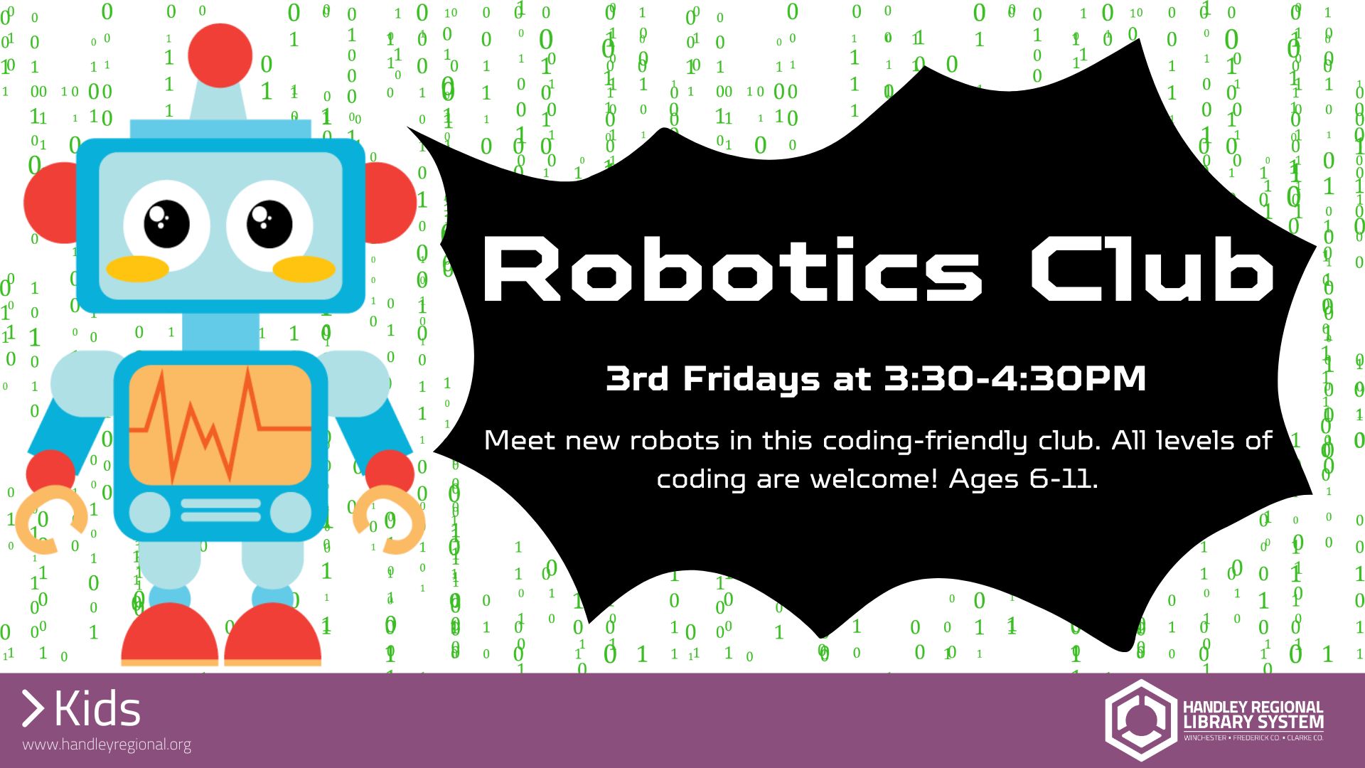 Primary tabs Upcoming List Month Week Day Remind Me Add To My Calendar Print Share Program Type: STEAM Age Group: Ages 6-11 Please note you are looking at an event that has already happened. Program Description Event Details Meet new robots in this coding-friendly club. All levels of coding are welcome! Ages 6-11.