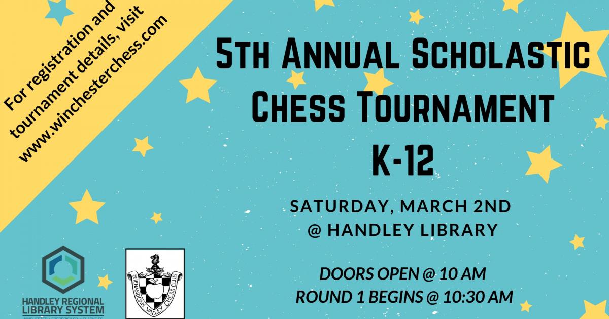 Students are invited to participate in the 5th Annual Scholastic Chess Tournament. Register in advance at www.winchesterchess.com. (ages 6-18)