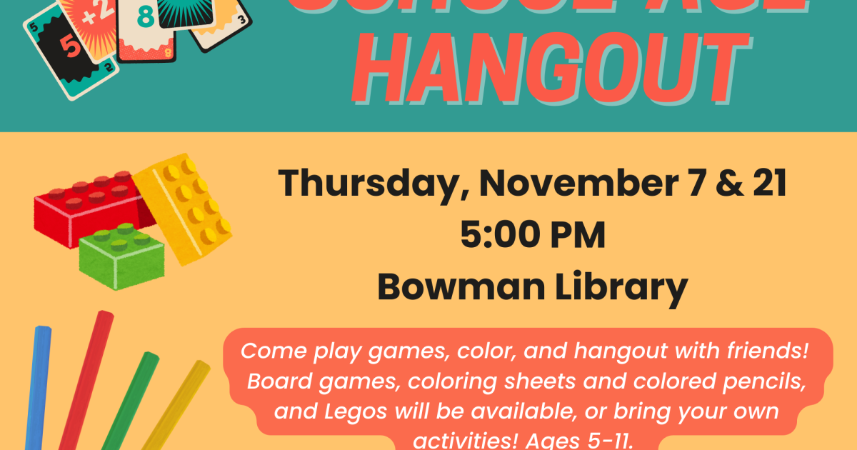 Board games, coloring sheets and colored pencils, and Legos will be available, or bring your own activities!