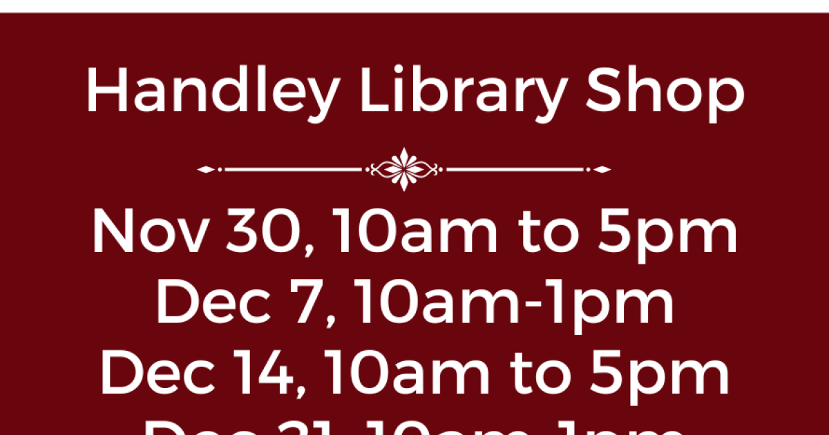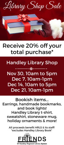 Stop by the Library Shop and enjoy 20%* off all purchases! Find bookish gifts for your library loving friends and family, including Handley Library t-shirts, sweatshirts and holiday ornaments. All proceeds benefit HRLS and its staff.