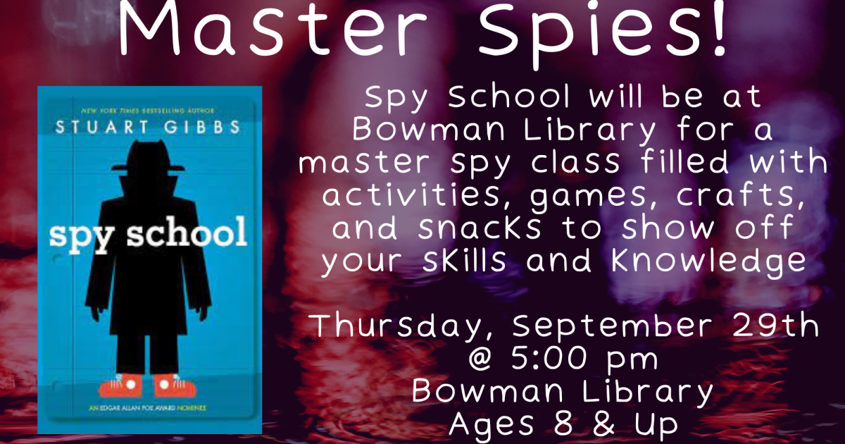 Calling all master spies in training!! Spy School is appearing at Bowman Library for one special evening where you will be able to prove and show off your Spy School series knowledge, skills, and abilities through activities, crafts, games, trivia, and even some snacks. Come learn some of the tricks of the trade which you can use at home and school to spy on your friends and family!
