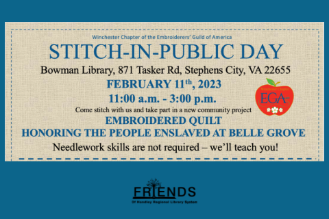 As part of Stitch In Public Day, Executive Director of Belle Grove Kristen Laise will explain the “Honoring” quilt project and about some of the 270 individuals enslaved at the plantation between 1783-1862. Attendees will learn how to make three basic stitches called the running stitch, backstitch, and split stitch from the President of Winchester Chapter of the Embroiderers’ Guild of America, Elaine Evans. Patrons will have a chance to select a name of the enslaved person and then stitch it. The workshop is free and open to the public. Stitching supplies are provided.