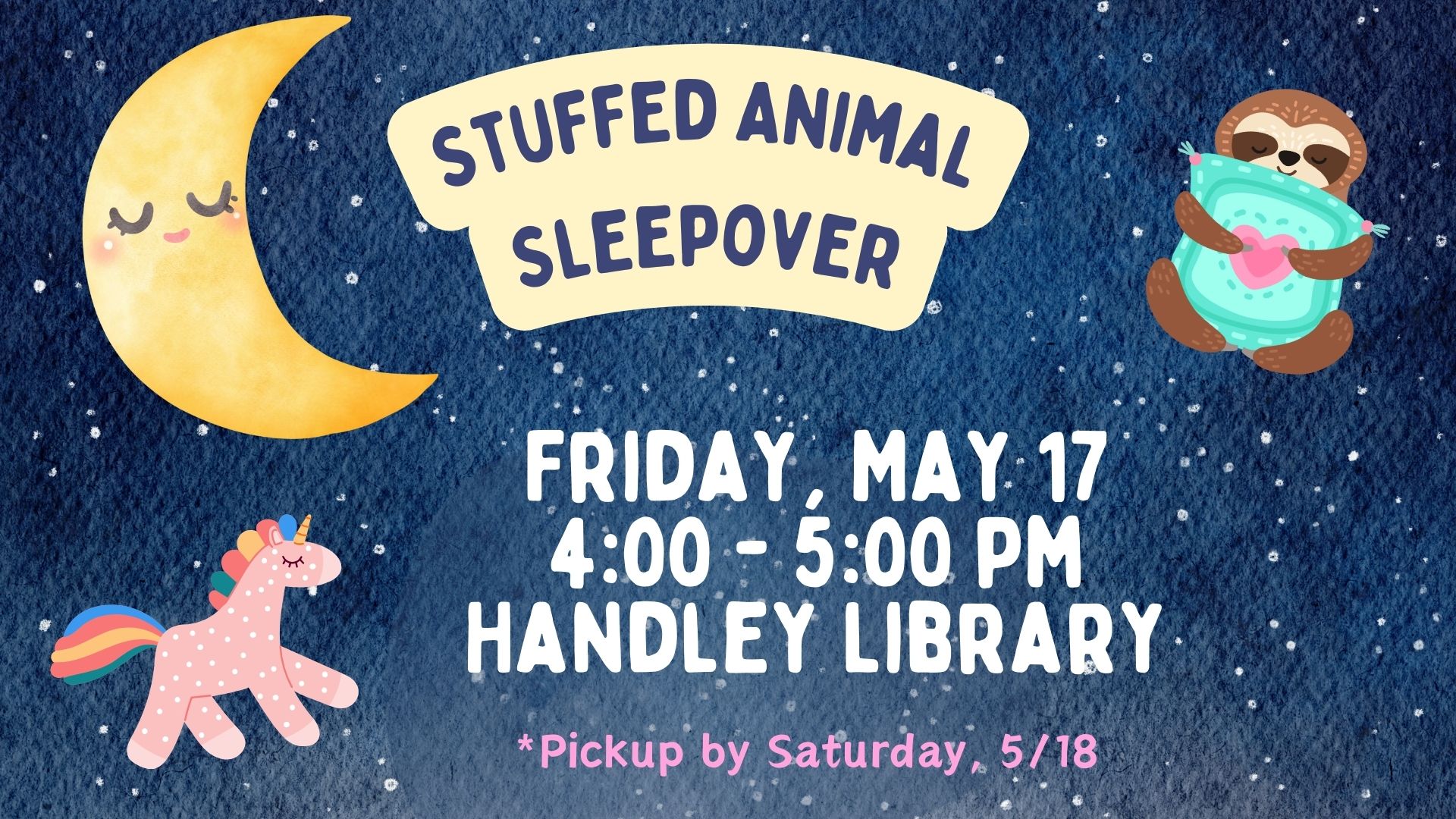 Bring your favorite stuffed animal for a fun sleepover at the library. Hear a story and do an activity, then say goodnight to your friend and find out the next day what fun was had! Pick-up your special stuffed animal on Saturday 5/18 between 10am-5pm. Ages 1-8.
