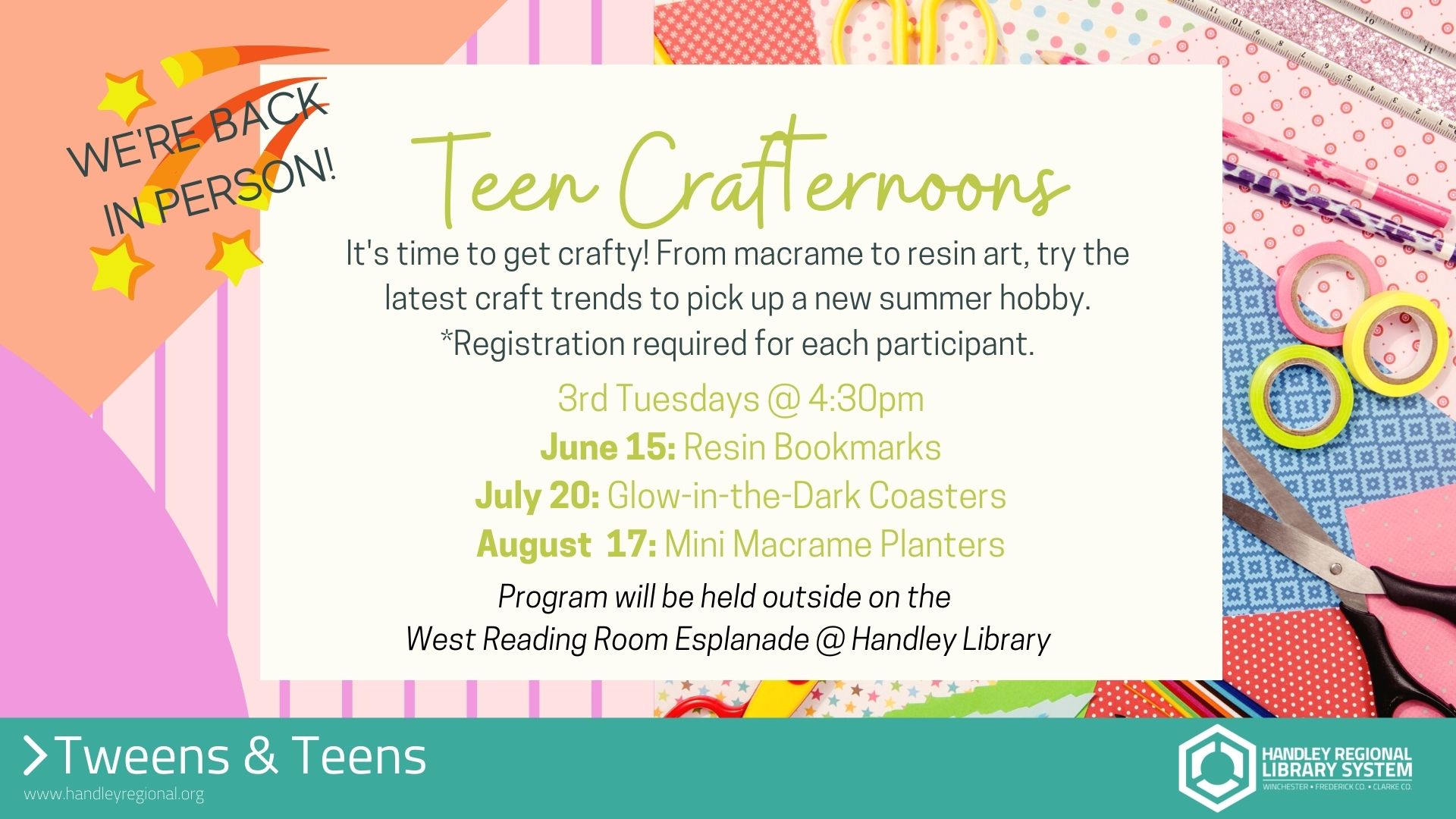 It's time to get crafty! From macrame to resin art, try the latest craft trends to pick up a new summer hobby. Pick up a Grab-and-Go Kit at the Handley branch for all supplies. Program held outside on the West Reading Room Esplanade (enter through the front doors of the library to be directed). *Registration required for each participant. Ages 12+.
