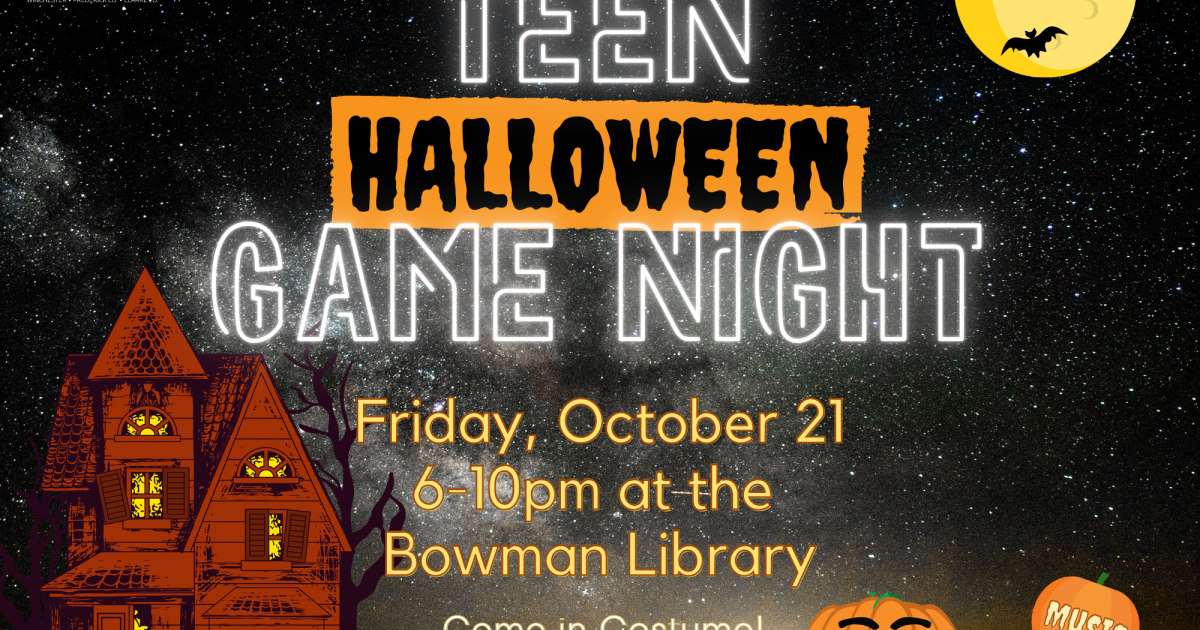 This month the library is staying up late to host this special Halloween edition of Teen Game Night. Wear a costume, if you desire (no weapons), and come to Bowman Library from 6-10pm for music, snacks, games, and pumpkin painting!