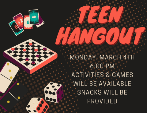 Join us for some games, activities, snacks, and time with friends. Games from Uno, Apples to Apples; as well as coloring, LEGO bricks, puzzles, and more will be available; or bring your own activities!