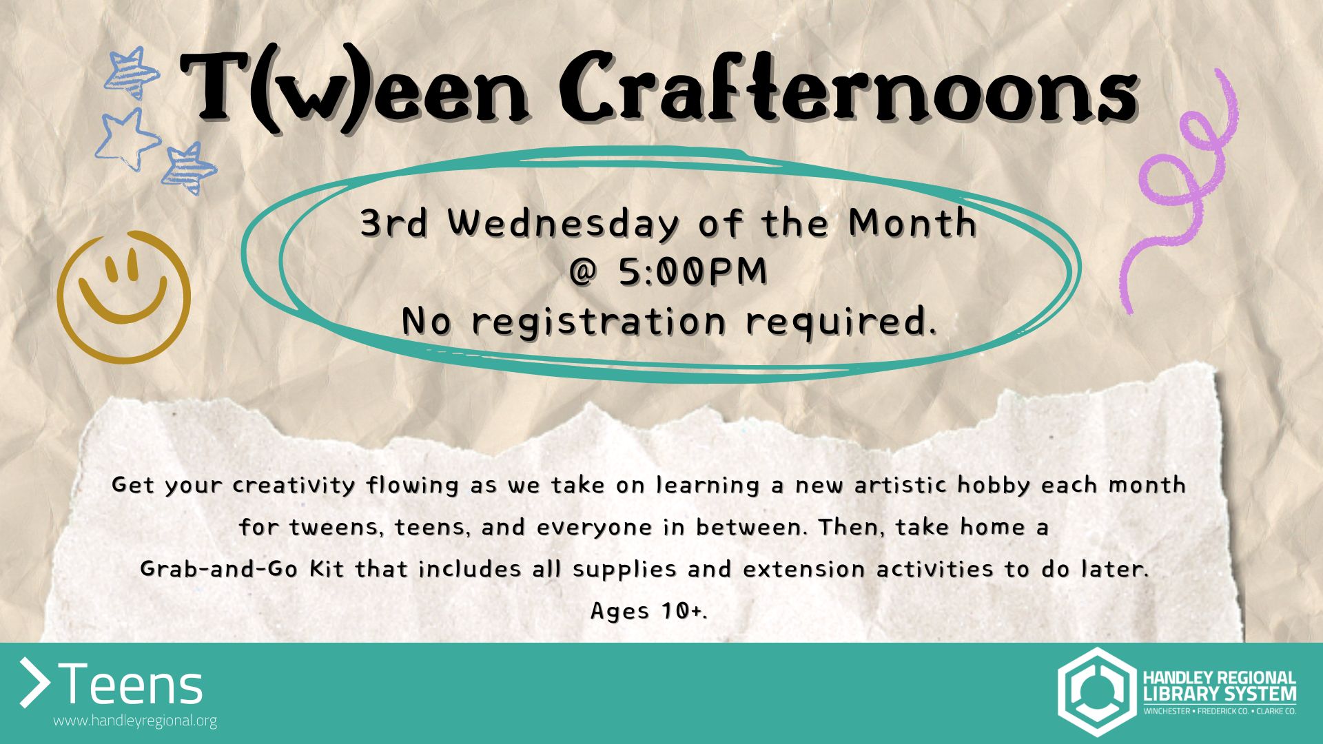 Get your creativity flowing as we take on learning a new artistic hobby each month in this pop-up program for tweens, teens, and everyone in between. Program is intended for Ages 10+.