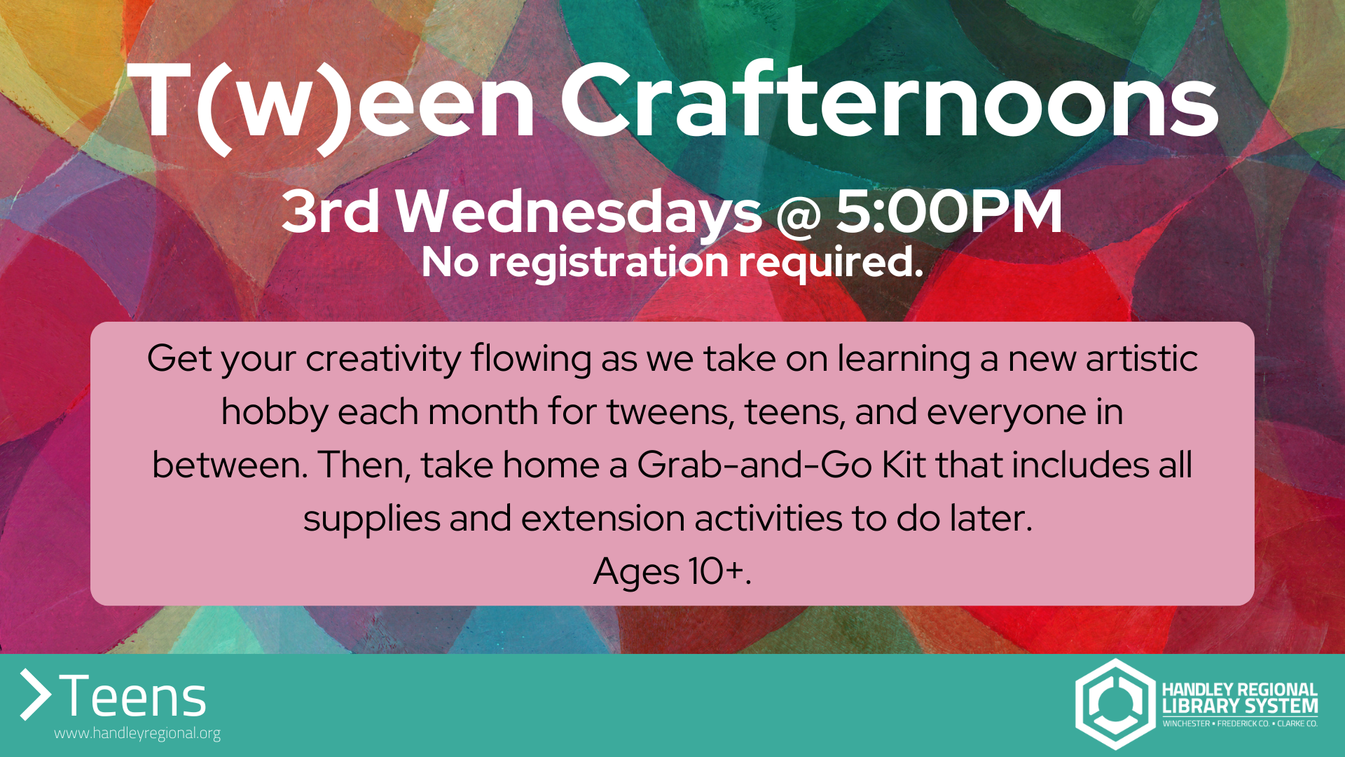 Get your creativity flowing as we learn a new artistic hobby each month for tweens, teens, and everyone in between. Then, take home a Grab-and-Go Kit that includes all supplies and extension activities to do later. Program is intended for Ages 10+.