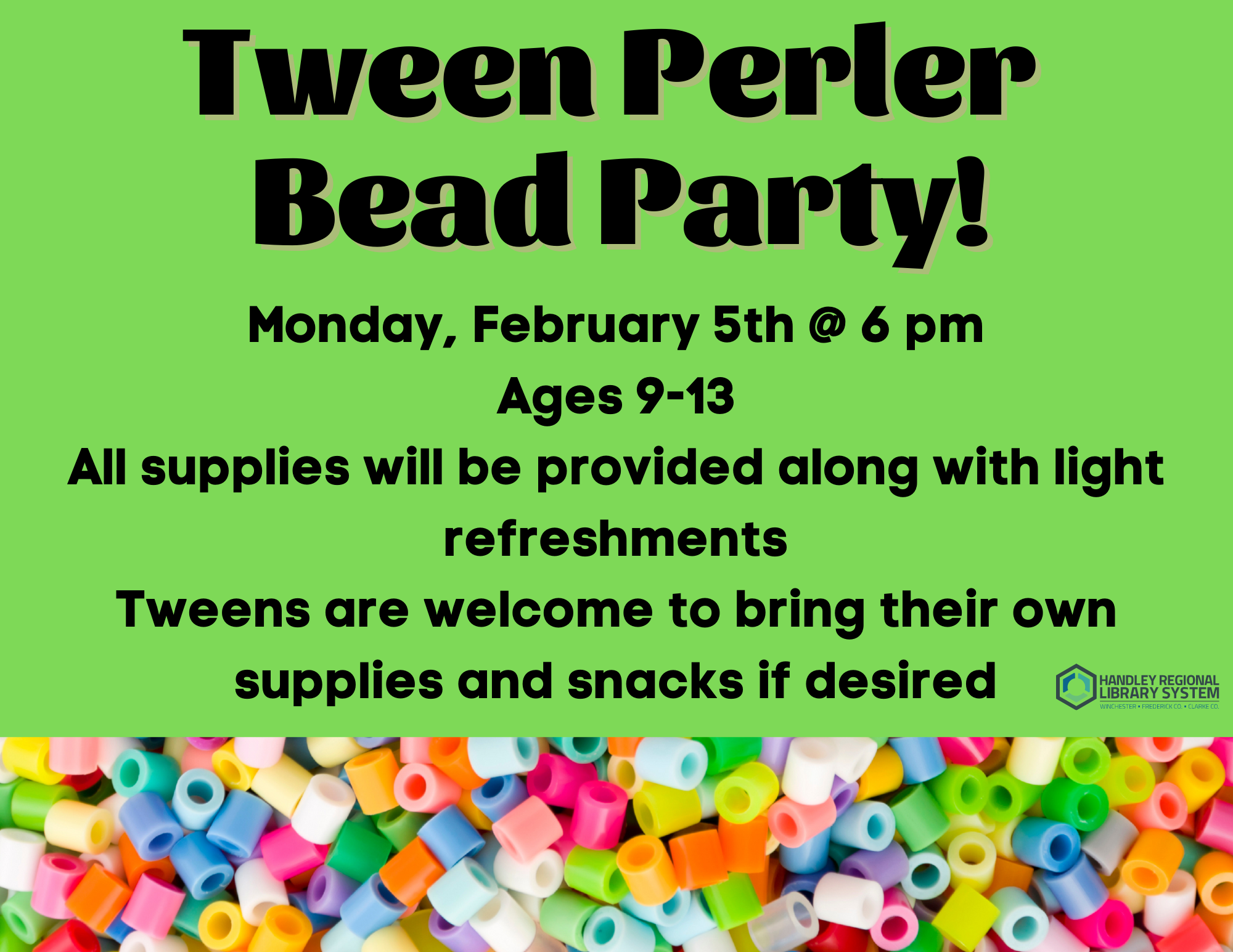 If you have your own Perler Bead materials and supplies you would like to use as well, please feel free to bring them along.