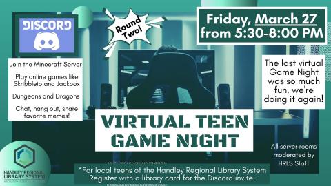 Participation will require access to a Discord account. All activities on the server during the event will be moderated by Handley Regional Library Staff.